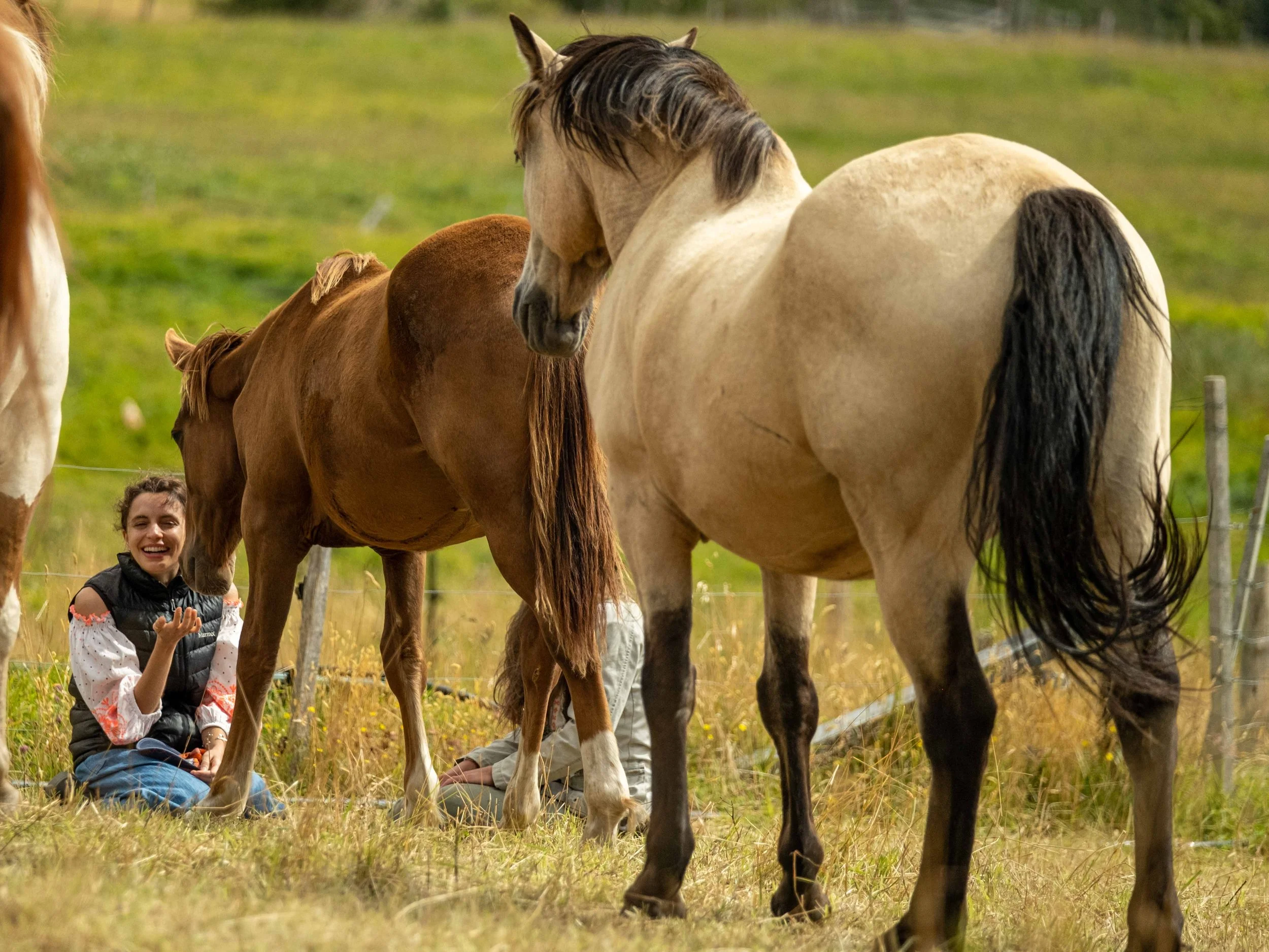 We work with the horses at liberty (no harnesses or ropes), within the herd, in the ecosystems where they roam and relate.